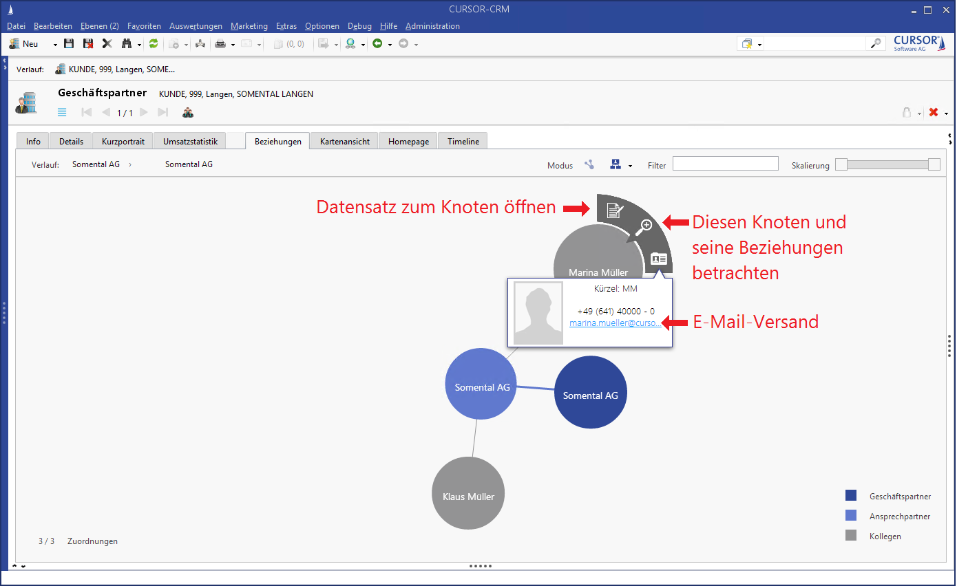 Eine Visitenkarte mit Kurzinformationen wie z.B. die Adresse des Geschäftspartners wird zum Knoten angezeigt. Falls eine E-Mail-Adresse hinterlegt ist, kann aus dem Graphen heraus die Standard-E-Mail-Anwendung gestartet werden.
