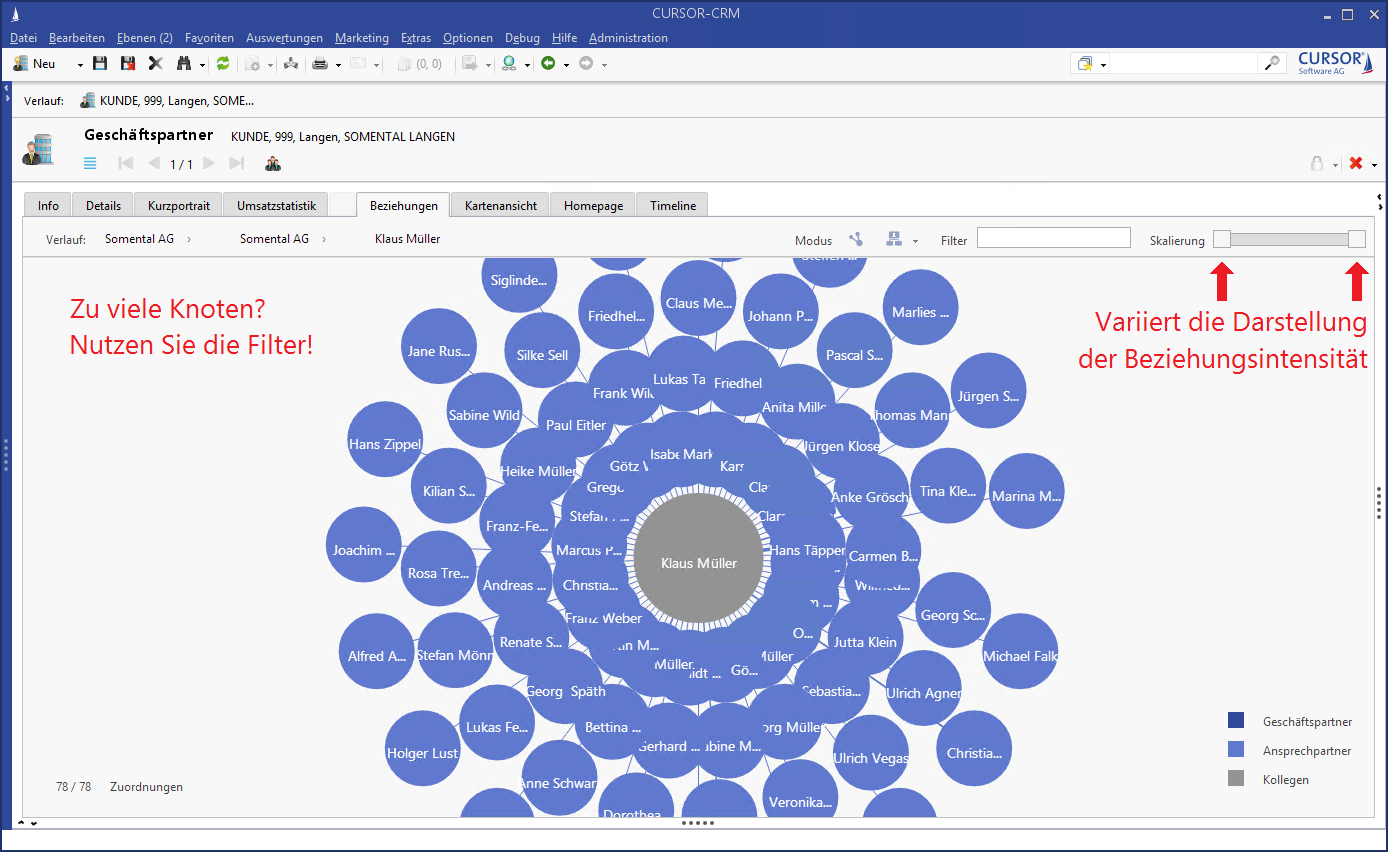 Die CURSOR-Beziehungsvisualisierung stellt Beziehungen zwischen Personen und Unternehmen im CRM-System in einer netzartigen Graphenstruktur visuell dar. Dabei kann die Darstellung an die Kontaktintensität zwischen zwei Personen angepasst werden, um diejenigen Personen zu ermitteln, die im häufigsten Kontakt zueinander stehen.