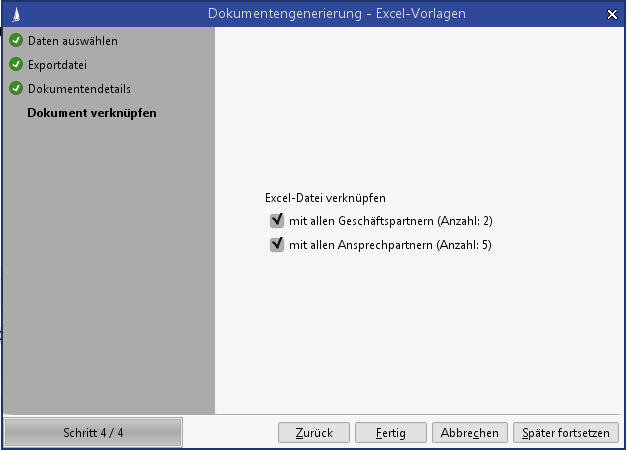 Im Assistent kann der Anwender entscheiden, ob die Exceldatei als Dokument in CRM gespeichert werden soll. Auf den Folgeseiten kann auch zusätzlich mit dem Ansprechpartner und Geschäftspartner verknüpft werden.