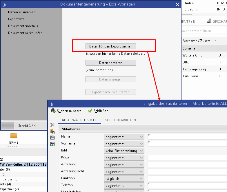 Die Daten aus CRM werden über die in der Excelvorlage hinterlegte Suche selektiert und in die kopierte Exceldatei übertragen.