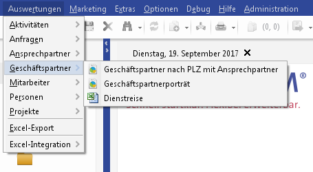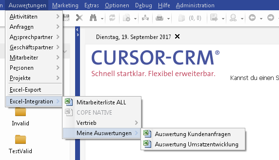 (per Drag&Drop aus dem Auswertungen-Menü)Externer Aufruf vom Typ EXCELTRANSFER (→ Externer Aufruf)