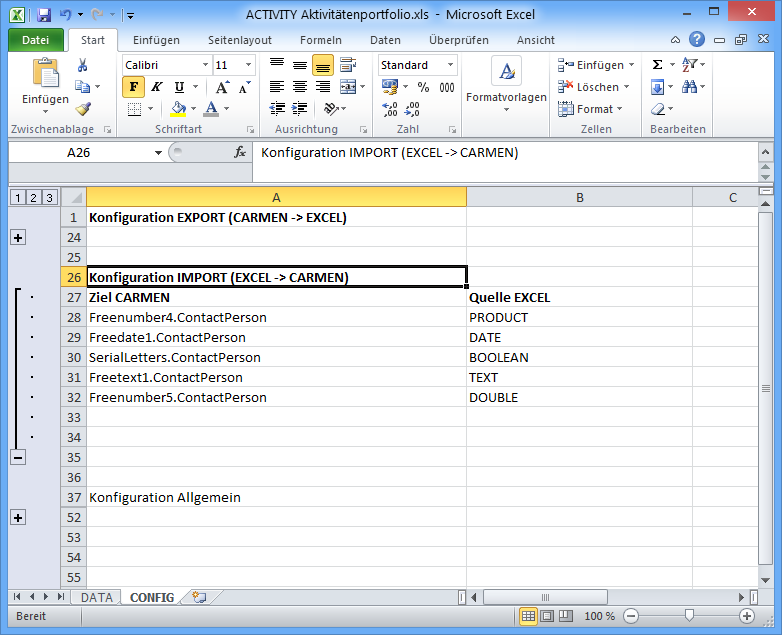 Arbeitsblatt für Daten nach CRM (Import) | AUSGANG (Name der Zelle: CONF_SHEETRESULT) | Auf diesem Datenblatt müssen sich die Excelzellen befinden, die für den Import nach CRM konfiguriert wurden. |