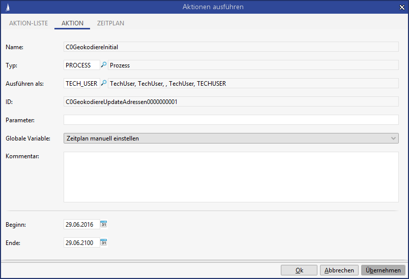 Standardmäßig wird ein C0-Prozess zur Geocodierung von Adressdaten im CRM ausgeliefert. Dieser verwendet als Startereignis "System-Start (Webservice, Timer, ProcessUtils.startProcess)" und kann somit regelmäßig über einen Timer ausgeführt werden.