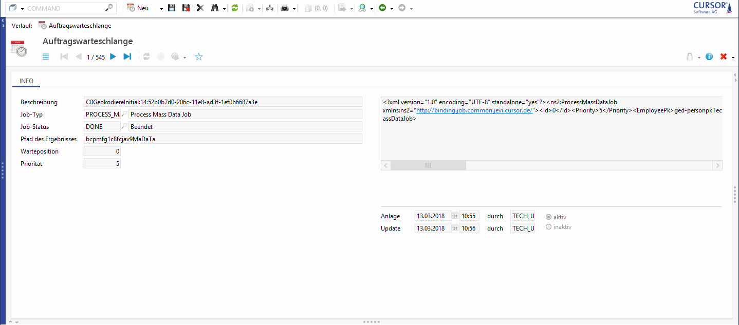 Auskunft über den Status des Prozesses innerhalb der Verarbeitungsdauer liefert ein Eintrag in den Massendatenaktionen.