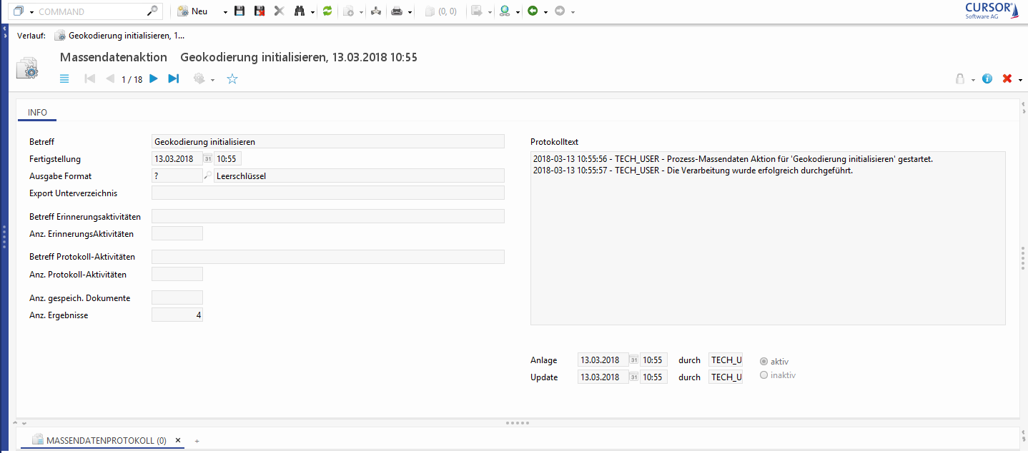 Hier ist beispielsweise ersichtlich, wie viele Ergebnisse vom Prozess verarbeitet wurden. Der Detailansicht einer Massendatenaktion kann entnommen werden, ob der Prozess erfolgreich ausgeführt werden konnte, oder ob es zu einem Fehler bei der Verarbeitung gekommen ist. Läuft der Geocodierungsprozess auf einen Fehler, so wird so lange kein weiterer Prozess gestartet, bis die fehlerhafte Instanz gelöscht wurde.