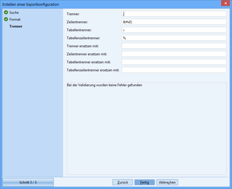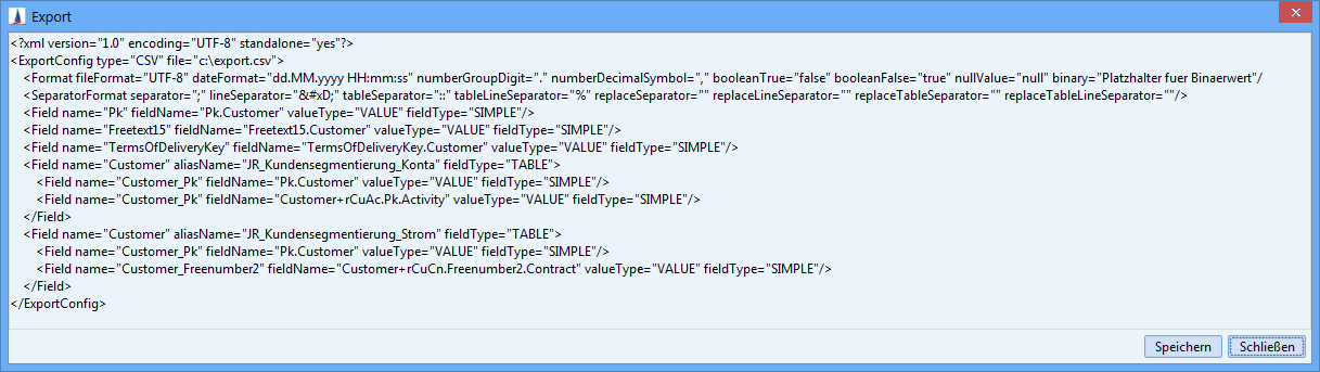 separator | Das Trennzeichen zwischen den einzelnen Werten, also den Feldern, die mit dem "Field"-Tag konfiguriert wurden. So ein Wert kann auch das Ergebnis einer Tabellensuche sein und dann aus mehreren mit dem "tableSeparator" getrennten und mit dem "tableLineSeparator" abgeschlossenen Werten bestehen. Darf nicht gleich einem der anderen Trennwerte sein oder einen davon enthalten. |