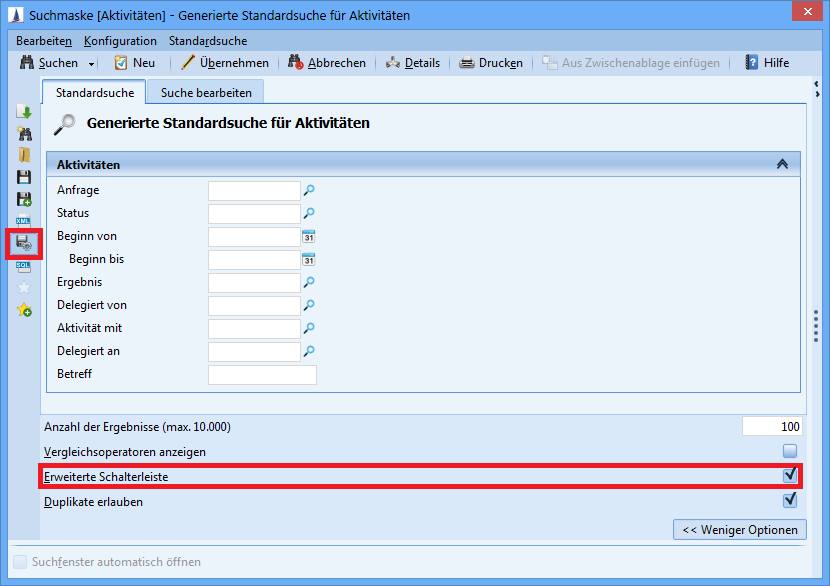 Um eine Konfiguration für eine Suche zu generieren, kann im Suchdialog über den Schalter Eine Export-Konfiguration für die Suche erstellen der Wizard gestartet werden. Dazu muss die erweiterte Schalterleiste aktiv sein.
