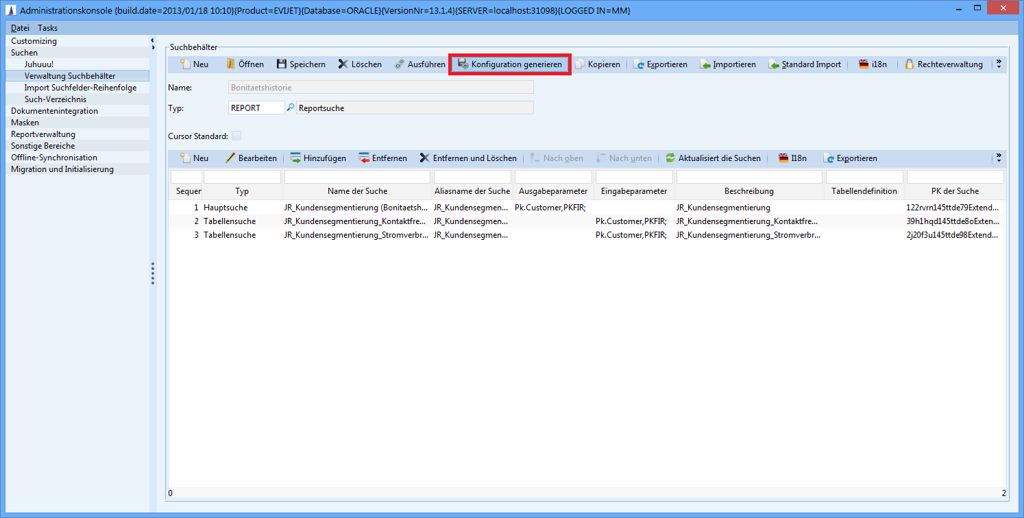 Um eine Konfiguration für eine komplexe Suche zu generieren, kann in der Adminkonsole unter dem Menüpunkt Verwaltung Komplexe Suchen über den Schalter Konfiguration generieren der Wizard gestartet werden.