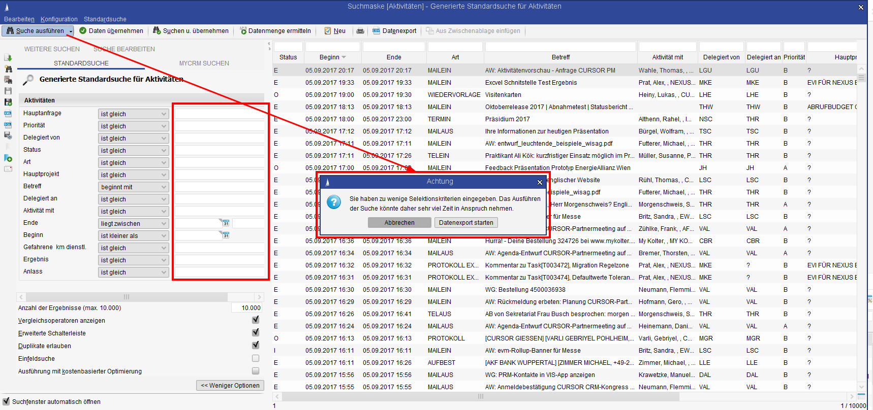 Wenn viele Daten exportiert werden, weil zu wenig Kriterien definiert wurden und die Prüfung der Suchkriterien vor Ausführung in den Systemeinstellungen aktiv ist, kann der Anwender die Daten trotzdem exportieren, da der ressourcenintesive Anfrage auf einem Massenserver ausgeführt wird.