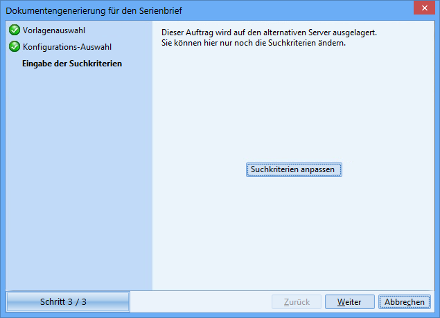 Im ersten Fall gleicht der Wizard im Folgenden dem bisherigen Vorgehen. Im zweiten Fall folgt nun nur noch eine Seite, auf der der Anwender die Suchkriterien der zugrunde liegenden komplexen Suche einschränken kann. Mit Beendigung des Wizards wird der entsprechende Job an den alternativen Server delegiert und der Anwender kann nun auf seine Fertigstellung warten.