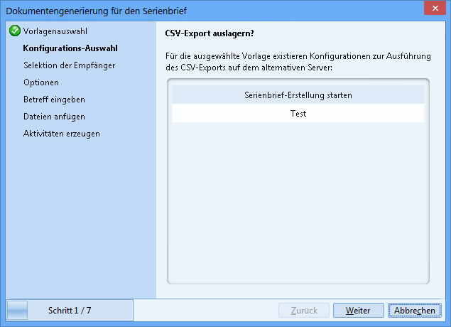 Hier gibt es wiederum 2 Möglichkeiten. Zum einen kann die Serienbrieferstellung auf dem Standardweg ('Serienbrief-Erstellung starten') durchgeführt werden. Zum anderen kann eine der existierenden Konfigurationen gewählt werden, um den Auftrag des CSV-Exports auf den alternativen Server zu delegieren.