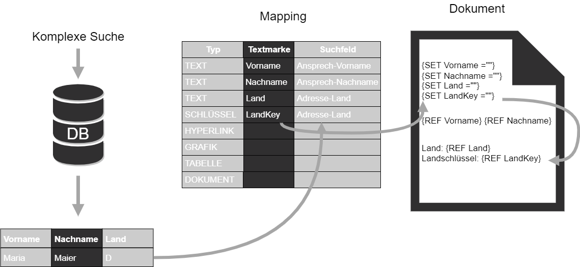 Über die Komplexe Suche, die mit der Vorlage verknüpft ist, werden die Daten aus der Anwendung selektiert. In der Zuordnungstabelle („Mapping-Tabelle“) ist die Zuordnung zwischen Suchfeld und dem Feld in der Dokumentenvorlage festgehalten.