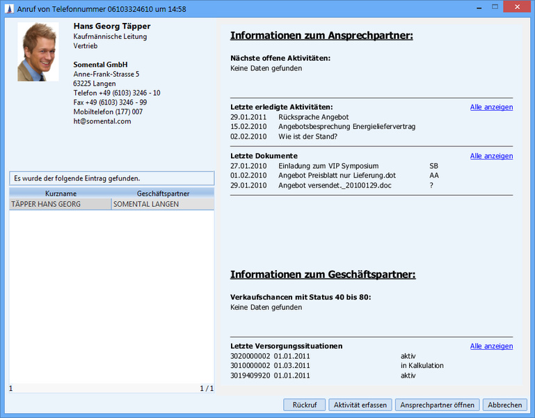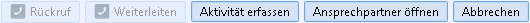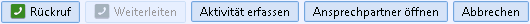 Für den aktuellen oder verpassten Anruf kann eine Aktivität angelegt werden. Diese Aktivität ist mit dem gefunden Ansprechpartner verknüpft und (im Standard nicht sichtbar) auch mit CTI Anruf.