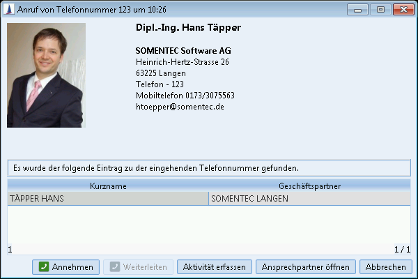 Erkennt die Telefonie-Schnittstelle einen eingehenden Anruf, wird ein Dialogfenster geöffnet.