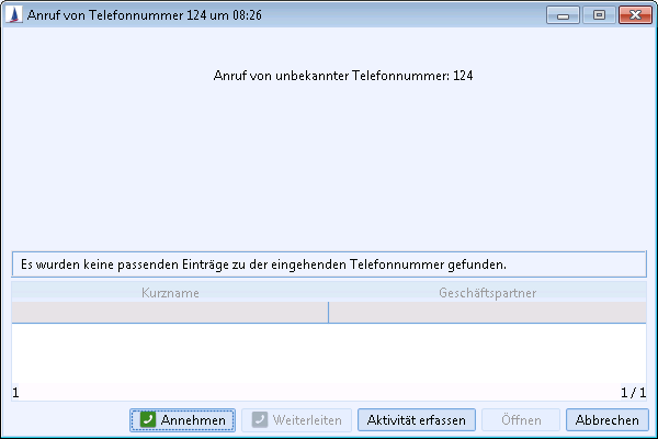 Ist die Nummer im System nicht bekannt, wird der Dialog trotzdem geöffnet. Die Nummer kann in der Nachbearbeitung einem Ansprechpartner zugewiesen werden.