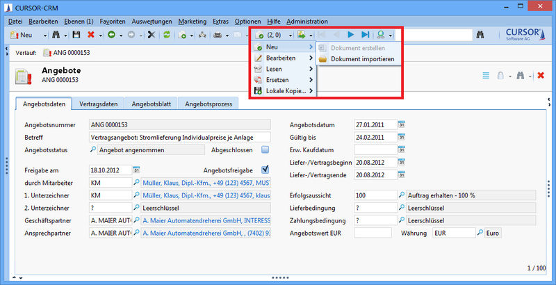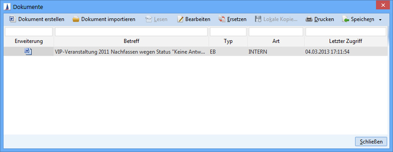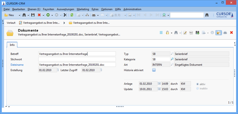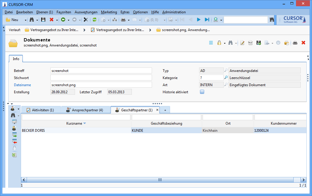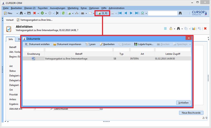CURSOR-CRM ermöglicht ein effizientes Dokumentenmanagement. Als 'Dokument' wird eine Anwendungsdatei beliebigen Formates bezeichnet, die mit einer Systemapplikation geöffnet oder bearbeitet werden kann.