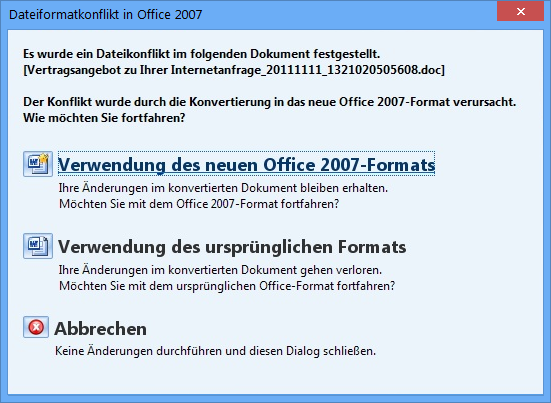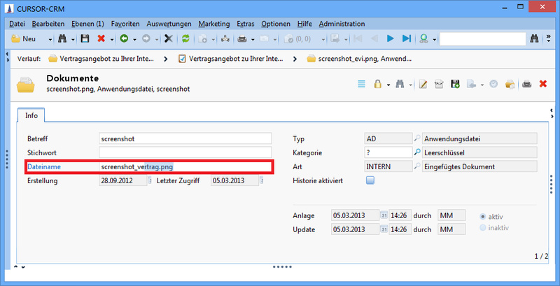 Bei generierten Dokumenten, wie z.B. Einzelbriefe, Angebote, Serienbriefe, Verträge wurde ein kryptischer Dokumentenname vom System vorgegeben, z.B. 1232544413620.doc.