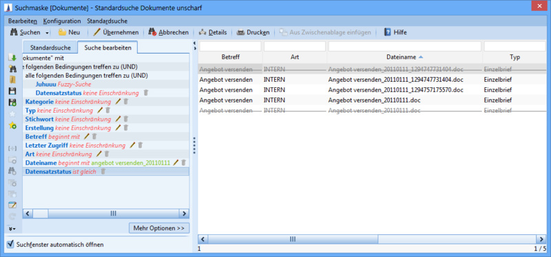 Besonders beim Versand einer Mail mit einem generierten Dokument als Anlage fällt diese Eigenschaft negativ auf, da der Empfänger mit dem kryptischen Namen nichts anfangen kann. Anstelle des kryptischen Dateinamens wird dieser nun aus dem Betreff des Assistenten und einem Zeitstempel generiert.