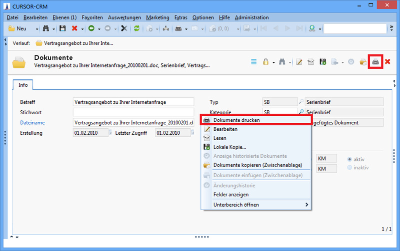 In der Schalterleiste der Dokumentenhauptmaske sowie im Kontextmenü des Datensatzes befindet sich ein Schalter