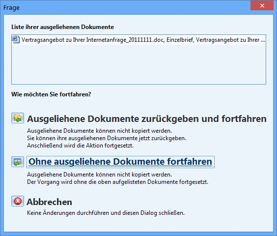 Der Anwender kann das Kopieren ohne diese Dokumente fortsetzen oder die Aktion abbrechen.