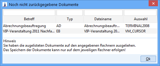 Beim Start der Anwendung wird daher geprüft, ob der Anwender Dokumente auf anderen Rechnern noch ausgeliehen hat. Ist dies der Fall erscheint der folgende Dialog zur Erinnerung für den Anwender.