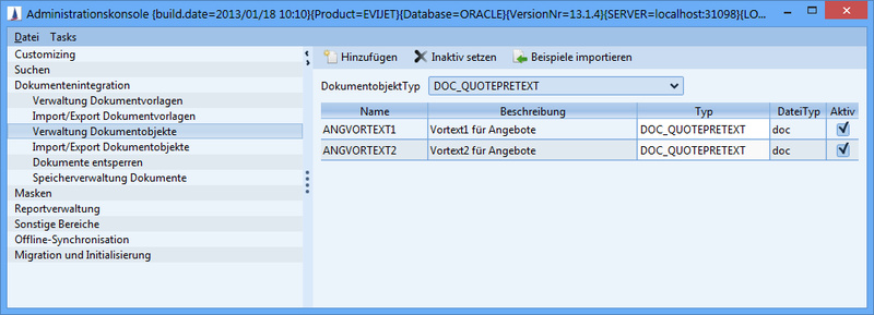 Inaktiv setzen | Das aktuelle Dokumentobjekt wird deaktiviert. Es steht somit dem Anwender nicht mehr zur Auswahl zur Verfügung. Dies entspicht dem Entfernen des Häkchens in Feld Aktiv |