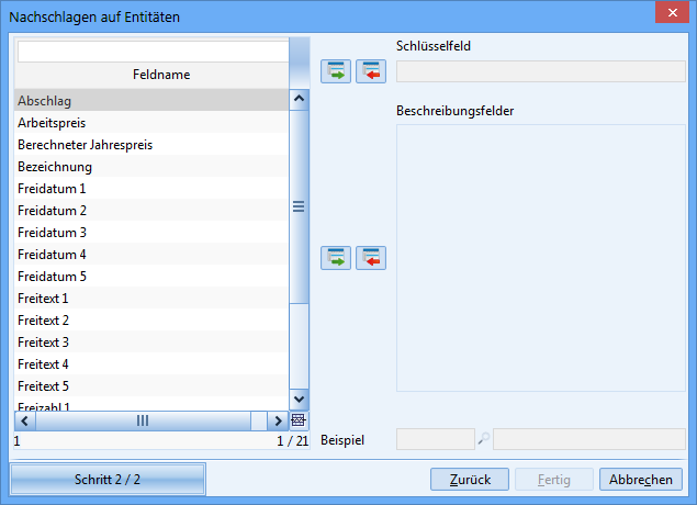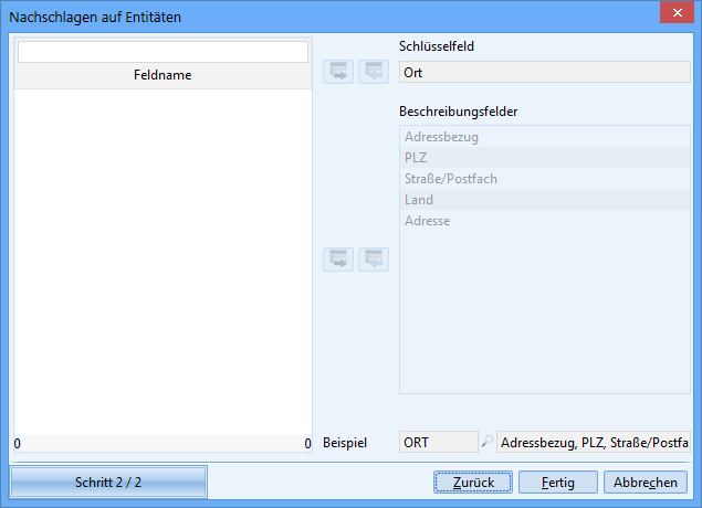 Sind noch keine Nachschlagedefinitionen für die ausgewählte Entität im System hinterlegt, erscheint der Auswahldialog zur Festlegung der Nachschlagefelder: