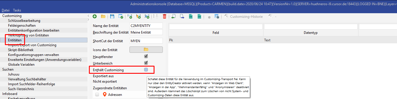 Im Knoten Entitäten können zusätzliche Objekte ("Customized Entitäten" sog. C2-Entitäten) in der Datenbank angelegt und mit anderen Objekten (Entitäten) verknüpft werden.