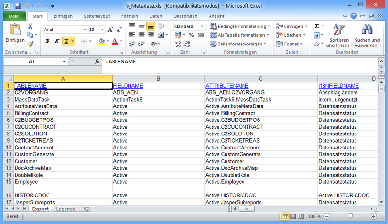 Export der Metadaten | Mit einem Klick auf den Schalter werden die Metadaten des Datenmodels in eine Excel-Datei exportiert und auf dem Client-Rechner direkt geöffnet. Zusätzlich wird eine Erläuterung der einzelnen Felder als Arbeitsblatt 'Legende' in die Excel-Datei aufgenommen. Das alte Export-Verzeichnis (Systemeinstellungen) wird nicht mehr benötigt ![]() Abbildung: Exportierte Metadaten in einer Excel-Datei |