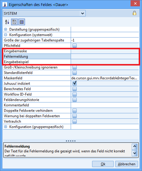 Eingabe-Fehlermeldung | In der Fehlermeldung für das Feld können kundenindividuelle Beschreibungen aufgenommen werden, die allerdings mit der Eingabemaske und dem Eingabebeispiel (vergl. Eingabebeispiel) korrelieren sollten. |