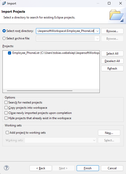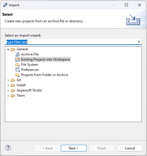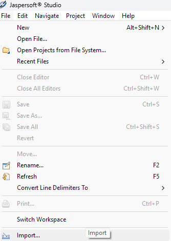 Zum Bearbeiten eines Reports wird ein eigenes Report-Projekt im Workspace-Verzeichnis des Jaspersoft Studios abgelegt: c:\users\<username>\JaspersoftWorkspace\<reportname>. Das Projekt muss erstmalig nach dem Öffnen des Designers als Projekt importiert werden.