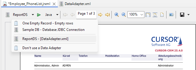/de/cursor/jevi/common/reports/ReportPreferences$!!$reportdesigner.url- Die Datenbank-URL für MSSQL oder ORCALE, z.B. 'jdbc:sqlserver:/server:1433;database=report;trustServerCertificate=true'/de/cursor/jevi/common/reports/ReportPreferences$!!$reportdesigner.user- Der Datenbank-Benutzer, z.B. 'report'/de/cursor/jevi/common/reports/ReportPreferences$!!$reportdesigner.password- [optional] Das Datenbank-Passwort, z.B. 'report'
