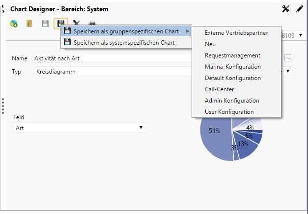 Als Administrator mit notwendigen Berechtigungen haben Sie die Möglichkeit, Charts zu konfigurieren und an definierte Benutzergruppen zu verteilen. Die Charts konfigurieren Sie immer für die Konstellation "übergeordnete Entität zum Unterbereich". Daraus folgt, dass Sie z.B. für die Unterbereichs-Entität Aktivität mehrere Charts zu der jeweiligen übergeordneten Entität konfigurieren können.