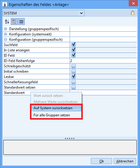Im Kontextmenü des Feldeigenschaften-Dialogs befindet sich der Eintrag Auf System zurücksetzen. Dieser setzt alle Einstellungen für das aktuelle Feld auf die Systemkonfiguration zurück.