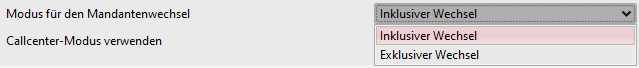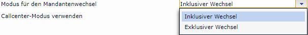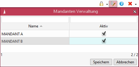 Ist dieser aktiviert, so kann der Benutzer über einer Combobox in der Haupt-Toolbar den aktiven Mandanten auswählen. Die Combobox ist dann verfügbar, wenn dem Benutzer mindestens zwei Mandanten zugewiesen sind.