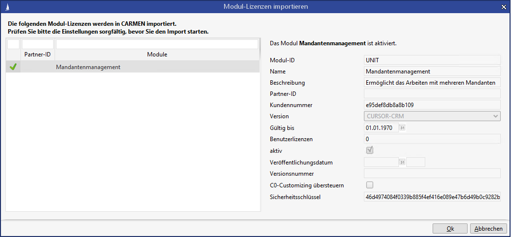 Für die Aktivierung des Mandantenmanagements muss die Lizenz "Mandantenmanagement" aktiviert werden.“