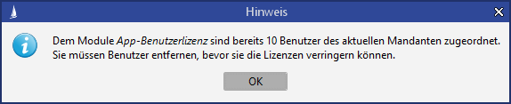Der Administrator muss mindestens so viele Lizenzen einem Mandanten zuweisen, wie bereits Benutzer des Mandanten der App- bzw. Client-Lizenz zugewiesen sind. Wird keine Anzahl der Lizenzen hinterlegt, so können beliebig viele Benutzer den Lizenzen zugewiesen werden, sofern genügend App- bzw. Client-Lizenzen insgesamt zur Verfügung stehen.