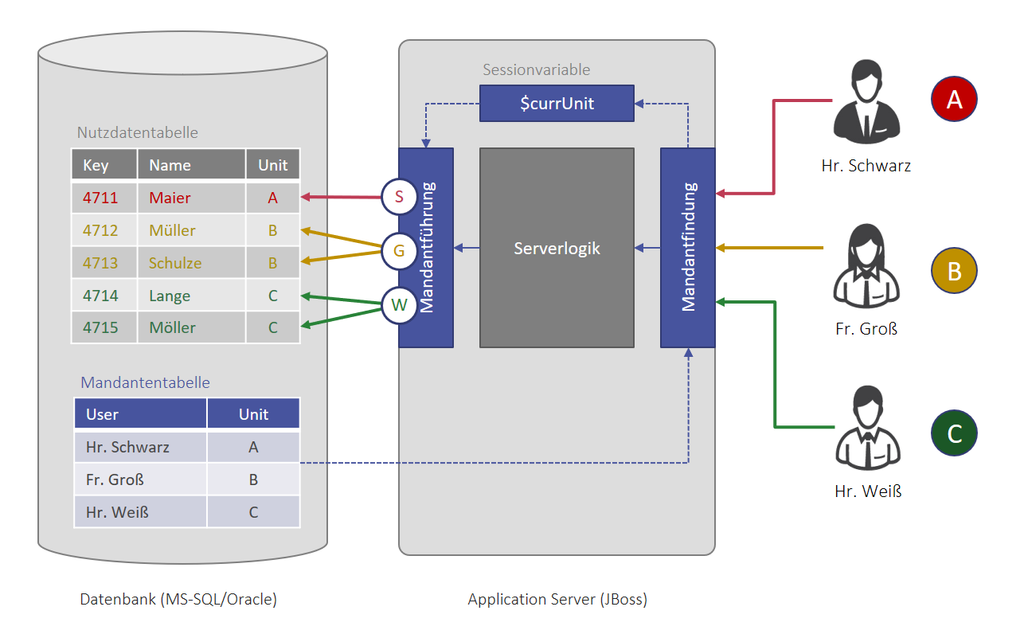Alle Tabellen verfügen über ein Mandanten-Feld, um die Daten einem (oder mehreren) Mandanten zuweisen zu können. Alle Benutzer werden vom Systemadministrator einem (oder mehreren) Mandanten zugewiesen. Bei Zugriff auf die Daten wird - an allen Stellen - die Mandantenkennung des aktuellen Benutzers berücksichtigt. Für die Organisation der Daten innerhalb der gemeinsamen Datenbank, kommen folgende Verfahren zu Einsatz: