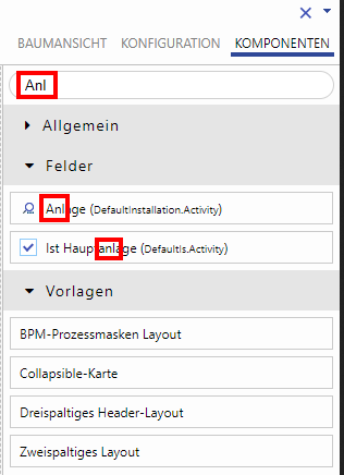 In der Komponentenansicht können verfügbare Felder nach Namen oder Teilnamen gefiltert werden, um so schneller auf das gewünschte Feld zugreifen und die Maskengestaltung vereinfachen zu können.