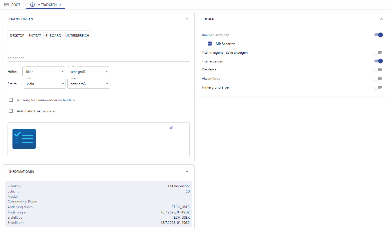 Hier befinden sich einiger Detailinformationen zur Kachel, wie z.B. Schicht- und Modulzugehörigkeit oder Zeitpunkt und Mitarbeiter der letzten Änderung.