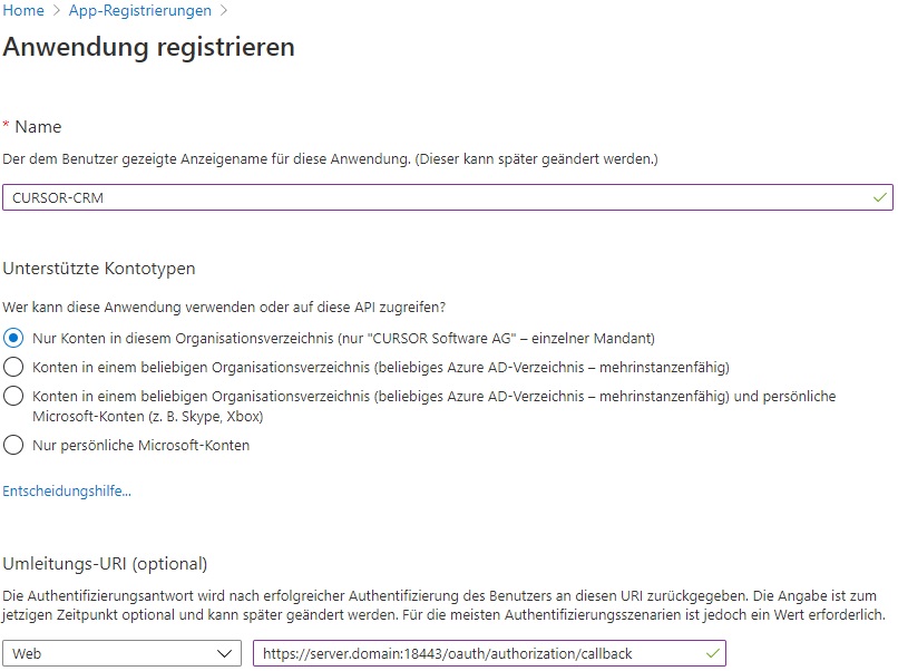 Registrierung CURSOR-CRM in der Microsoft Azure Cloud