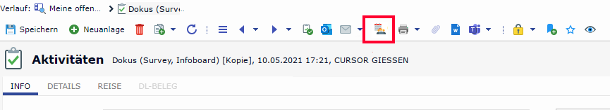 Besprechung | ![]() ![]() | Öffnet den Dialog zum Versenden der Besprechungsanfrage. Die o.g. Werte aus der Aktivität werden übergeben. Wurde die Besprechungsanfrage bereits versendet ist der Button ausgegraut. Wurde die Besprechungsanfrage bereits versendet UND dies ist eine Teams-Besprechung, so kann man über diesen Button die MS Teams Besprechung aufrufen. |