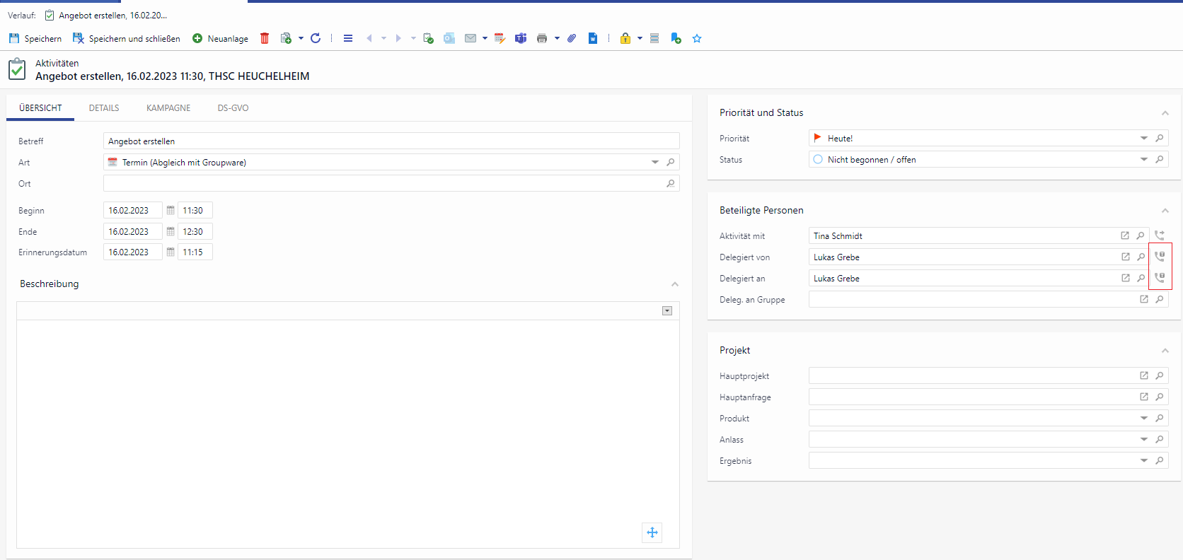 Wenn man auf den Button klickt, gelangt man in den gleichen Dialog wie in dem CRM-Kalender und auch auf dem Ansprechpartner.