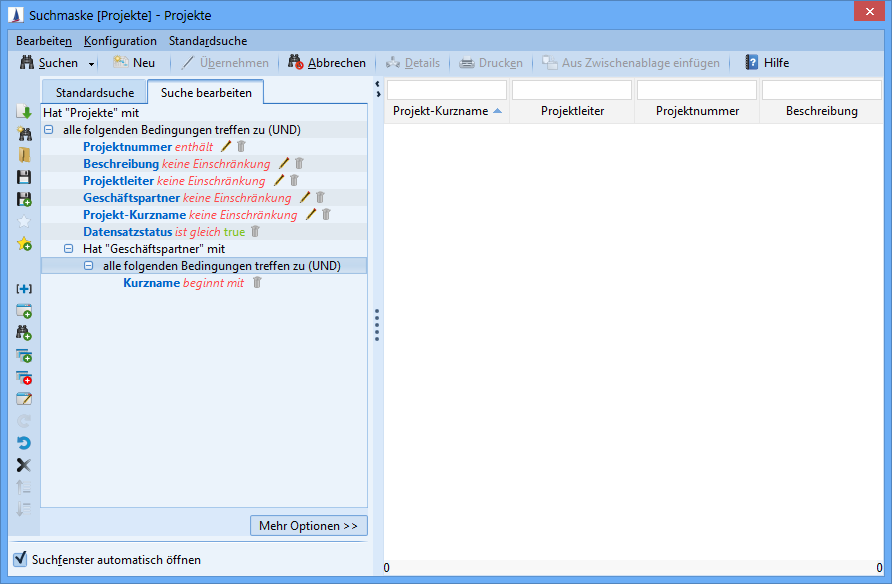 Wird diese Suche direkt aus der Suchverwaltung geladen, werden keine Suchkriterien vorgegeben.