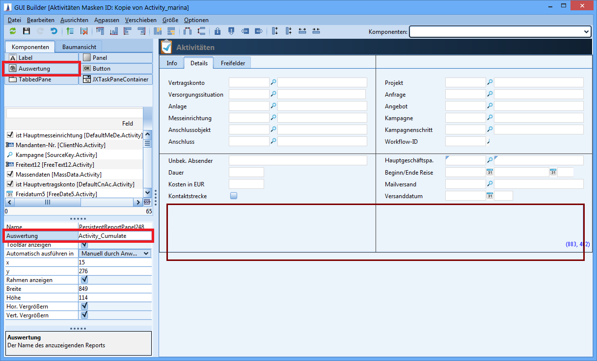 Mit Hilfe des Schalters Auswertung kann ein Rahmen auf der Maske platziert werden, in dem die Auswertung angezeigt wird. Der Rahmen erhält die zusätzliche Eigenschaft Auswertung, hier wird der interne Name der Auswertung (Activity_Cumulative) angegeben.