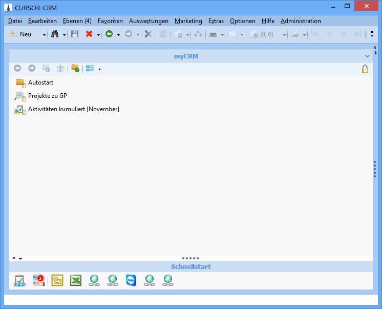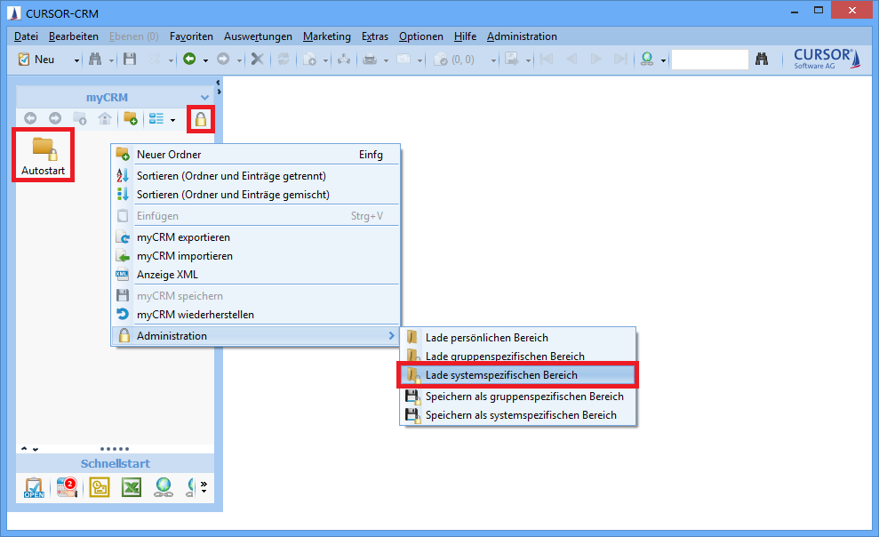 Hierzu legen Sie einen Ordner mit dem Namen Autostart in myCRM an. Anschließend eine Suche und/oder eine oder mehrere Favoriten in den Autostart-Ordner aufnehmen.