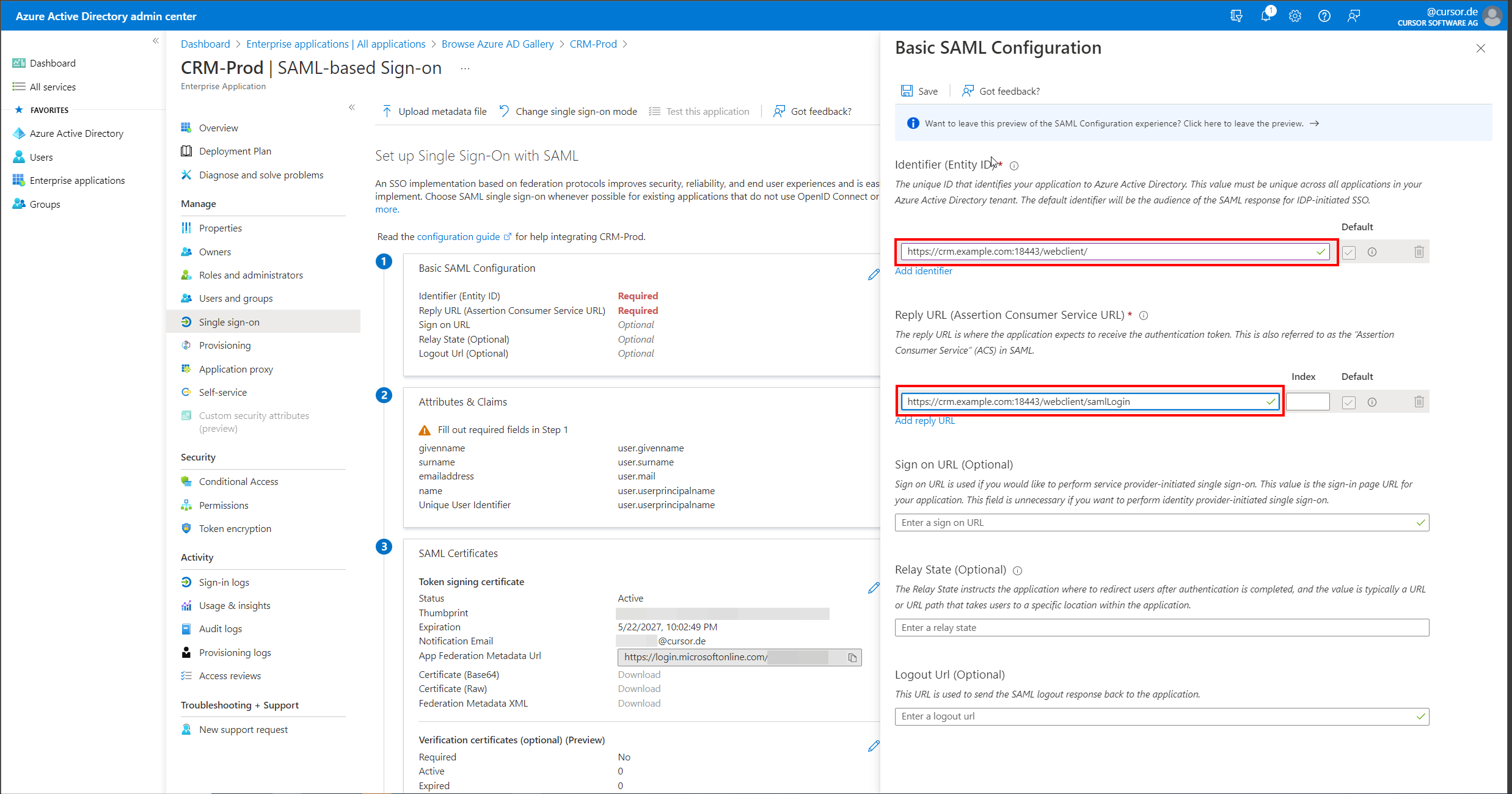 Nach der Ausführung dieser Schritte ist die Konfiguration von Azure AD für die Nutzung von SAML 2.0 mit CURSOR-CRM abgeschlossen. Als nächste Schritte sollte nun auch das CRM-System in den Systemeinstellungen für die Nutzung von SAML konfiguriert werden. Außerdem muss in den Mitarbeiterdatensätzen das Feld "SAML Login-Name" (SAMLLoginName.Employee) so gesetzt sein, dass es genau den von Azure AD gesendeten Name IDs entspricht, damit die Nutzerzuordnung vorgenommen werden kann.