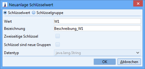 Neuer Schlüssel / Neue Gruppe | Sie können hiermit die Neuanlage eines neuen Schlüssels oder einer Schlüsselgruppe durchführen. Vergeben Sie den Schlüsselwert (eindeutig) und eine Bezeichnung (Langtext). Es ist nicht möglich, einen Schlüsselwert zweimalig zu vergeben. Sie werden gegebenenfalls darauf hingewiesen. |