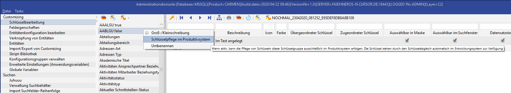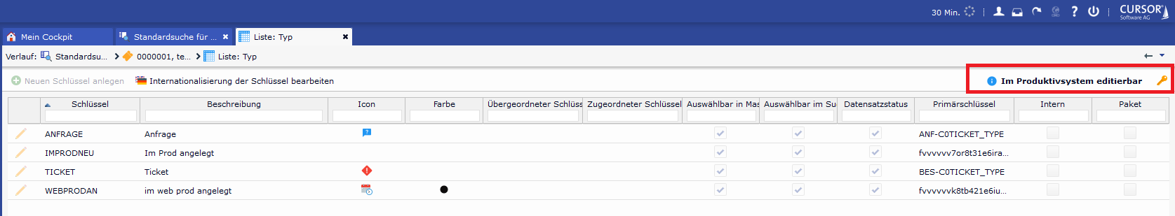 Schlüssel von Schlüsselgruppen, welche die Eigenschaft "Schlüsselpflege im Produktivsystem" besitzen, können von Usern, welche die entsprechenden Berechtigungen zur Schlüsselpflege besitzen, ausschließlich im Produktivsystem angelegt und bearbeitet werden. Die Pflege des i18n, Icons und/oder Farben für Schlüssel innerhalb von Schlüsselgruppen, die diese Eigenschaft besitzen, erfolgt ebenfalls ausschließlich im Produktivsystem. Eine so gekennzeichnete Schlüsselgruppe erhält im Entwicklungssystem in der Toolbar der Schlüsselbearbeitung einen textuellen Hinweis auf die ausschließliche Pflegbarkeit im Produktivsystem.