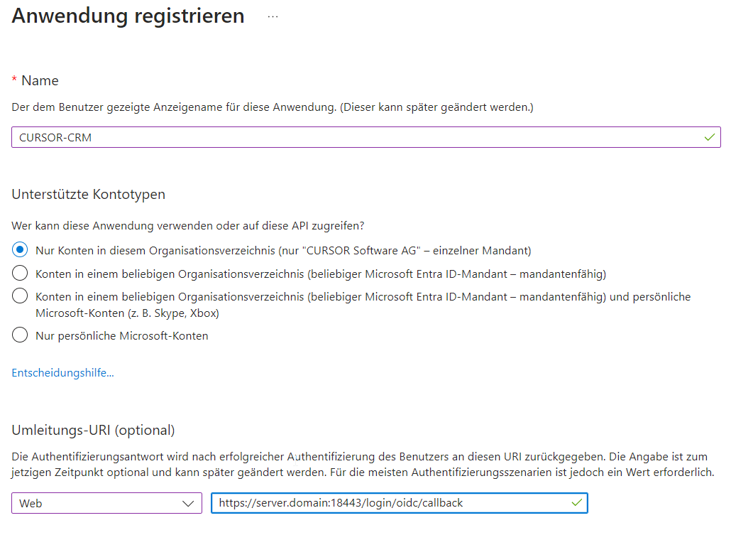 Registrierung CURSOR-CRM in der Microsoft Azure Active Directory